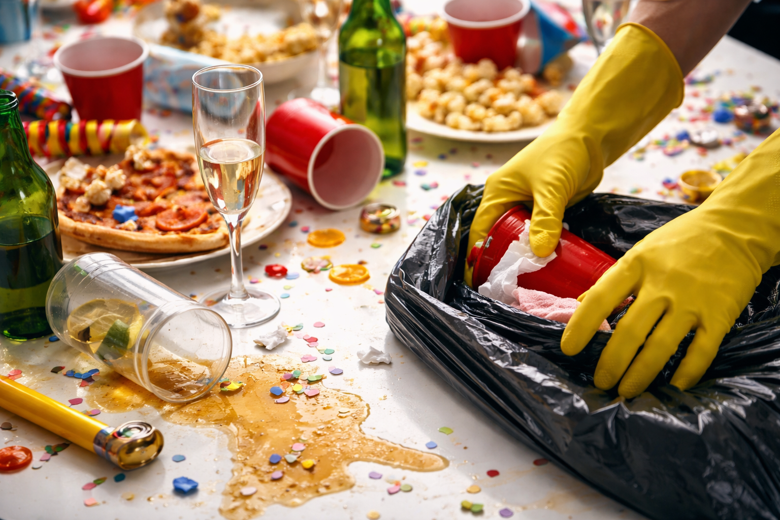 A great party always leaves behind memories — laughter, music, conversations… and, unfortunately, a mess. Sticky floors, scattered trash, stains on furniture, and overflowing bins are common after any celebration. What felt like a perfect evening can quickly turn into a stressful morning when you’re faced with cleaning everything yourself. In fact, after-party cleanup is often described as overwhelming due to the volume of waste, spills, and disorganization left behind .
